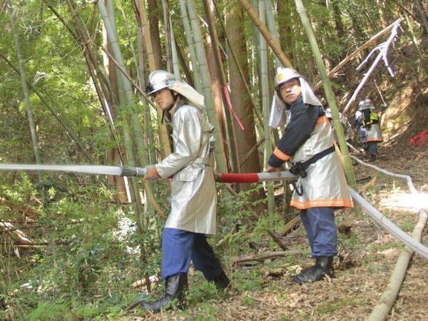 奥武蔵中学校裏の山林にて9分団との合同中継送水訓練を行いました。