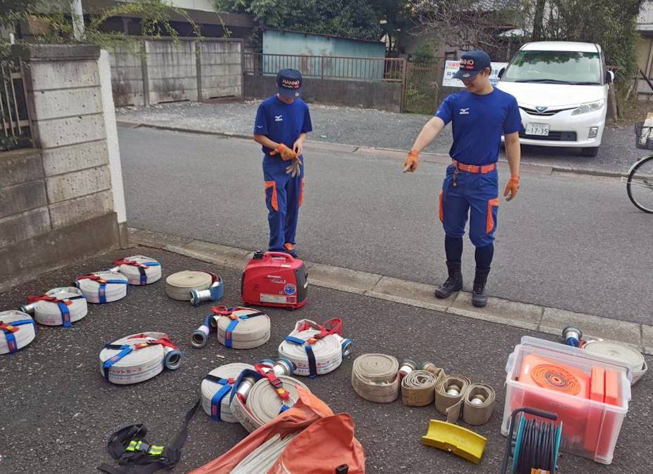 当日は、器械器具の点検を実施しました。半年に一度の大規模な点検として、日頃の訓練でのホースの傷み具合を確認し支給されている多くの消防貸与品の数量チェックや整理を丁寧に行いました。