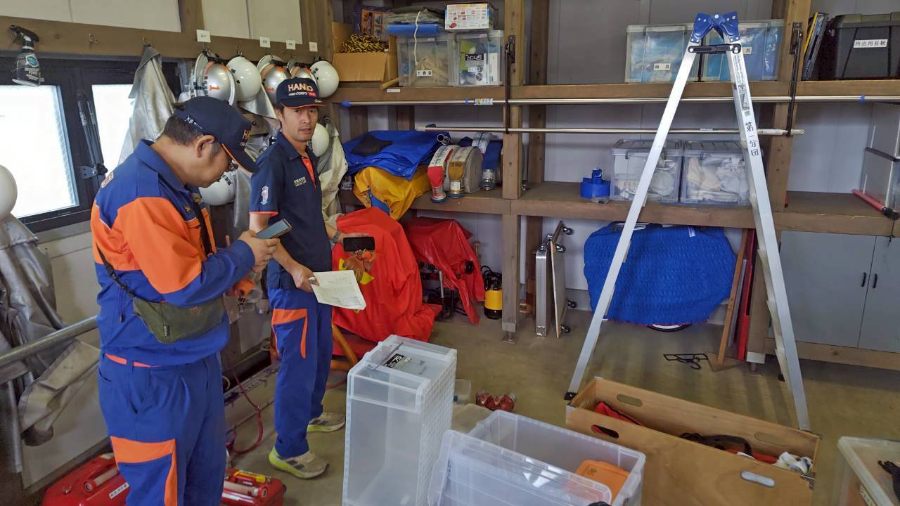 資機材を広げて資機材を点検する様子 浅見武司 班長、齋藤有喜雄 団員