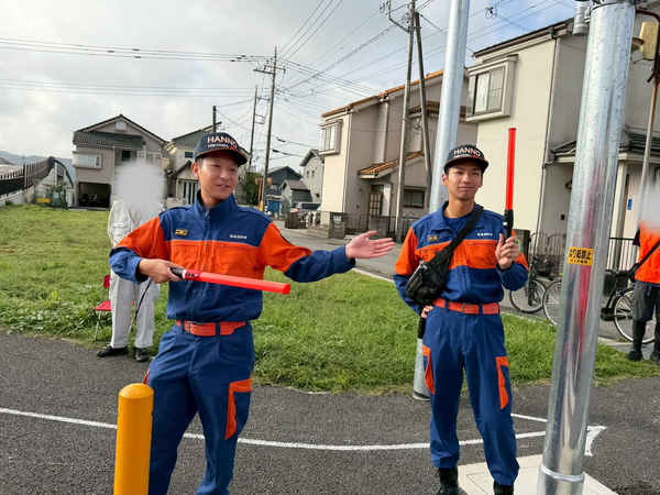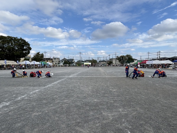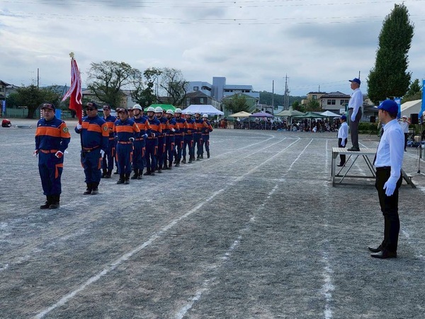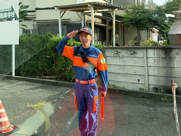 令和7年10月5日(日)加治小学校にて加治スポーツ祭が開催され第6分団は朝に行われた聖火リレーの警備とお昼の時間に操法展示をさせて頂きました。無事にランナー達が通過できるように警備に努める団員たち。加治スポーツ祭中の様子と操法展示中
