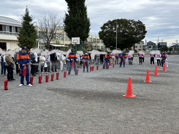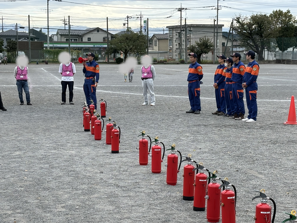 屋外では水消火器を用いた初期消火訓練を行いました。