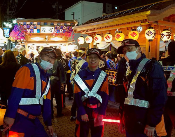 警備の合間に夜のお祭りを楽しむ。柴田美郷班長、高内聡隼団員、石井健之副分団長