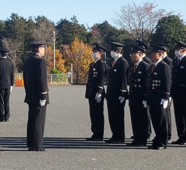 飯能日高消防署屋外訓練場にて飯能消防団消防特別点検が行われました。 服装規律の点検を受け小隊、中隊訓練、倒壊建物救出訓練、一斉放水、分列行進を実施 点検官の講評・訓示を承りました。